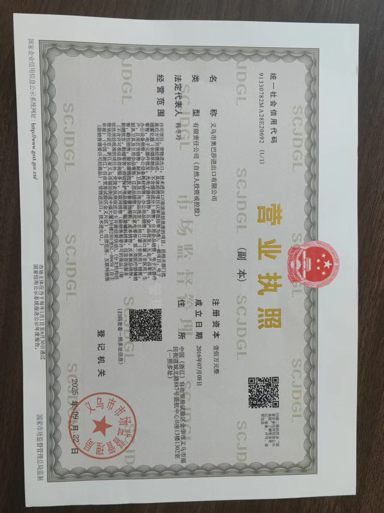 Registered address : Room 1302, 13th Floor, Building B, Shenghang Center, No. 887 Chengbei Road, Futian Street Jinhua Zhejiang China
